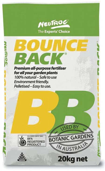 Neutrog’s Bounce Back is a 20kg bag of pelletized, composted chicken manure-based fertilizer. It is an Australian Certified Organic (ACO) product designed for all-purpose use on lawns, vegetables, and flowers, providing a slow-release nutrient boost. The formula promotes healthy growth, improves soil health, and is free from pathogens and weed seeds.